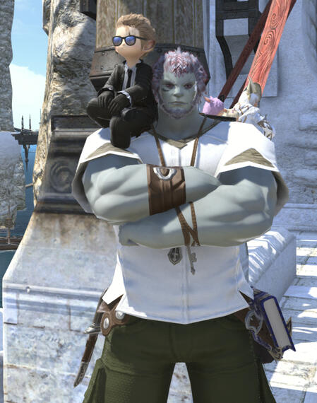 Spell Thief and local tease, Crashing Glacier met Lydia when the Roegadyn stumbled into her master's clinic. A more flamboyant friend, Crashing looks to make a stylish display to any audience she encounters (even the yellow jackets wanting to put her in the brig). Meaning that she's often an regular for Lydia to patch up.